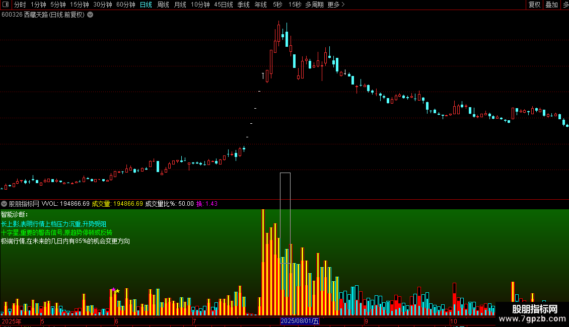 异:=MA(V,135)COLORLIBLUE,LINETHICK2;