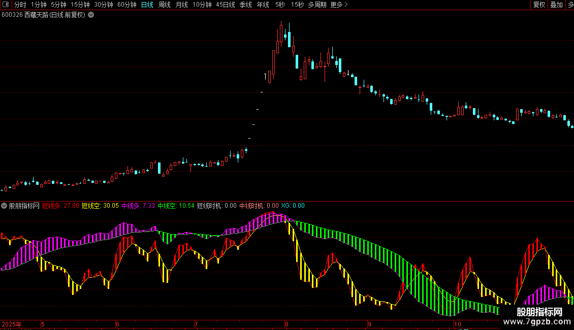 XG:短线时机 AND 中线时机 AND 短线多>中线多 AND DYNAINFO(4)>0,COLORCYAN,NODRAW;