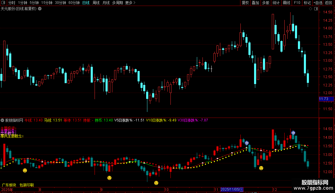 马线:MA(牛线,5),COLORYELLOW,LINETHICK4,POINTDOT;