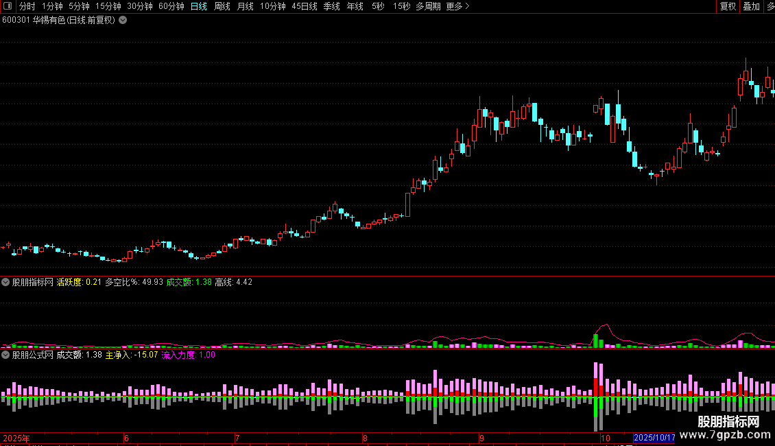 活跃度:(LARGEINTRDVOL+LARGEOUTTRDVOL)*10000/(2*FINANCE(7)),NODRAW,COLOR00FFFF;