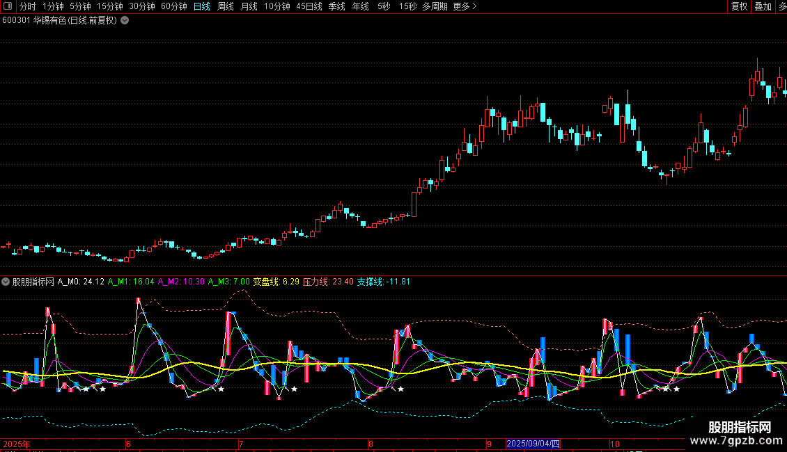 支撑线:MA(KML,21)-2.2*STD(KML,21),DOTLINE,COLORCYAN;