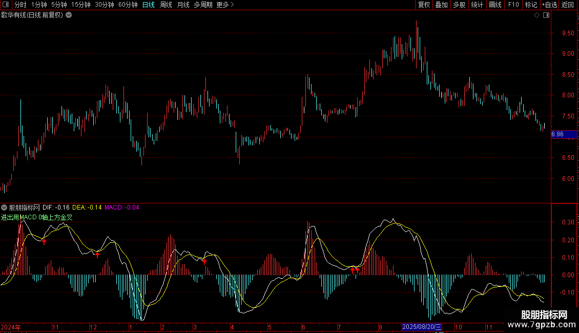 核心方法:将MACD参数放大5倍,获得类似周线MACD的数据形态,再结合原版MACD寻找买卖点。根据策略逻辑,当放大5倍周期的MACD双线上穿0轴后进行颜色标记,该模型理论强调周线DIF和DEA同步位于0轴上方,代表近期走势强势。买卖信号则依据日线MACD的水上金叉。