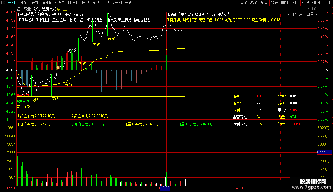 本“分时突破”指标聚焦日内交易,融合资金流、量价关系、MACD及财务数据等多维度信息,核心追踪资金攻击力度、机构/散户买卖盘占比,同时标定分时突破位、支撑位,还嵌入财务预警、估值数据等关键信息,全方位判断个股日内强弱与突破机会,帮助投资者精准识别拉升、冲涨停信号。