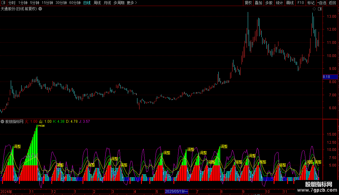 DRAWTEXT(REF(火,3)>0 AND REF(火,2)>0 AND REF(火,1)>0 AND 火=0 AND REF(火,1)>山,REF(火,1),'调整'),COLORYELLOW , ;