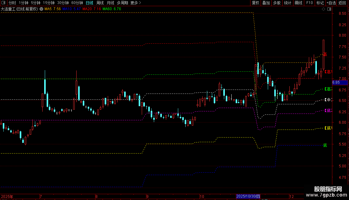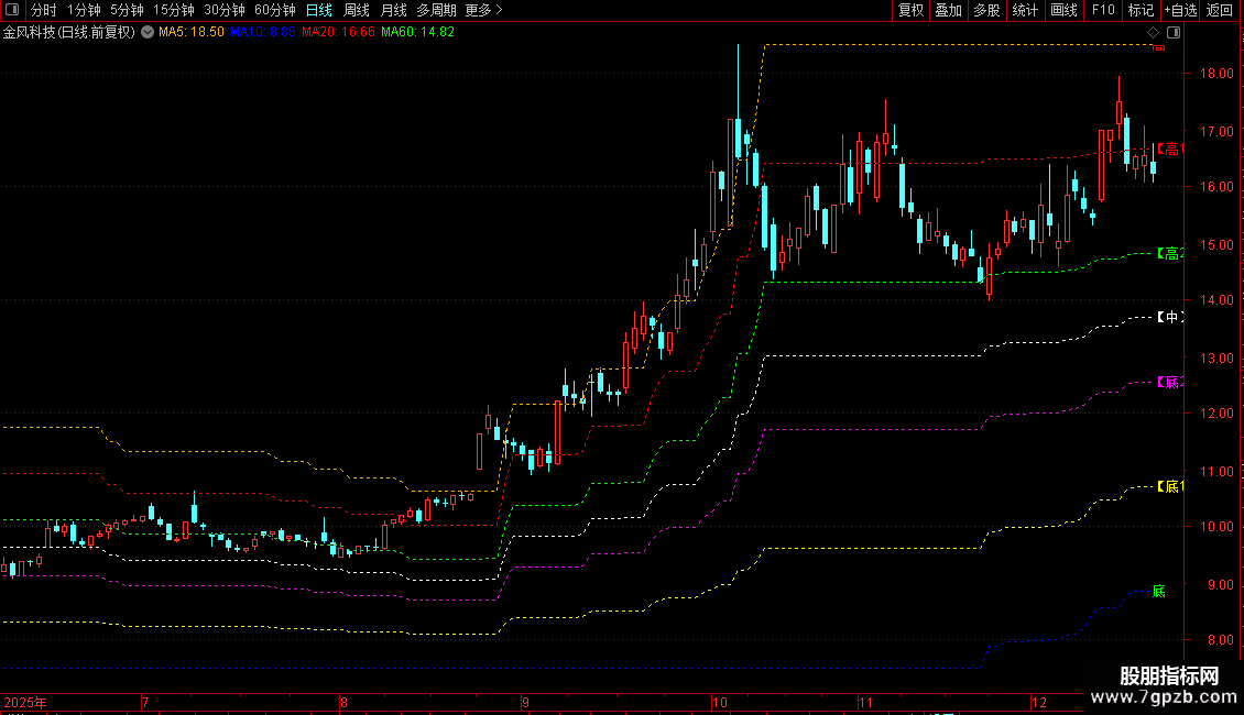 指标主要功能是绘制近期价格区间的高低点,并在此基础上划分多个关键支撑与阻力位,采用常见的黄金分割比例进行水平线标记。这些分位线有助于观察价格在回调或反弹过程中可能遇到的支撑或压力位置。操作上,投资者可结合价格接近这些分位时的走势反应,辅助判断短期买卖时机或设置止盈止损点。
