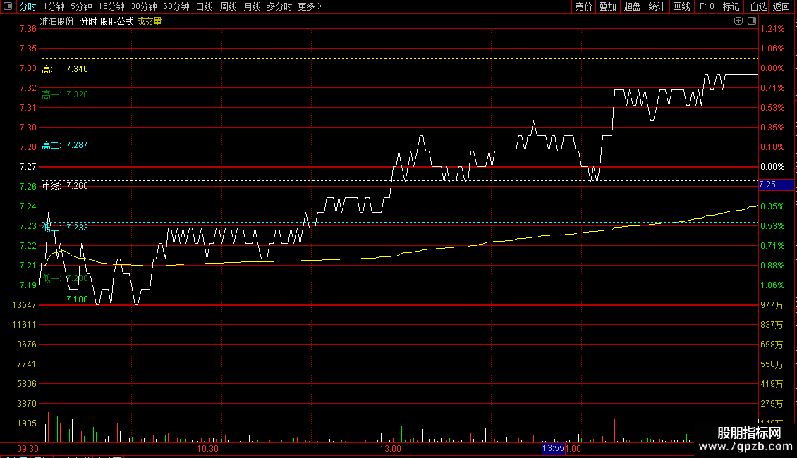 高低分割分时组主图指标是通达信软件中针对分时行情分析的实用工具,核心功能为基于当日分时走势的高低点数据,自动绘制黄金分割比例的分割线,并清晰标注 “高、中、低” 核心档位,以及 “高一、低一、高二、低二” 等细分分割位。该指标依托黄金分割的经典理论,以分时图中的当日最高价、最低价为基准,等关键黄金分割比例,自动完成画线操作,无需手动调整。画线结果直观呈现在分时主图中,“中” 位对应 0.5 分割线,是多空博弈的核心分水岭;“高一 / 高二” 向上延伸至高位分割区,“低一 / 低二” 向下覆盖低位分割区,快速识别分时行情中的支撑与压力位,为判断提供清晰的参考