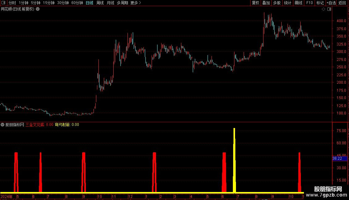 MACD金叉:=IF(CROSS(DIFF,DEA) AND DIFF<0.3,38,0)COLORRED,LINETHICK2;