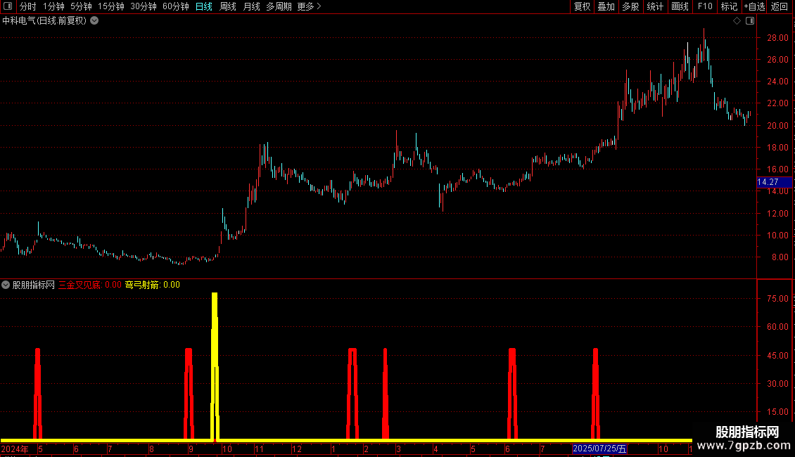 零上二金叉:=IF(CROSS(DIFF,DEA) AND OZ=1,44444,0)COLORFFFF00,LINETHICK4;