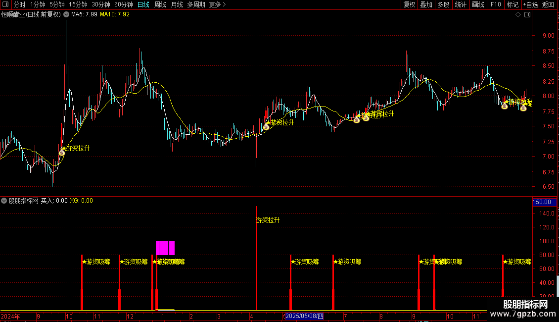 当满足条件游资拉升时,在最低价位置画9号图标