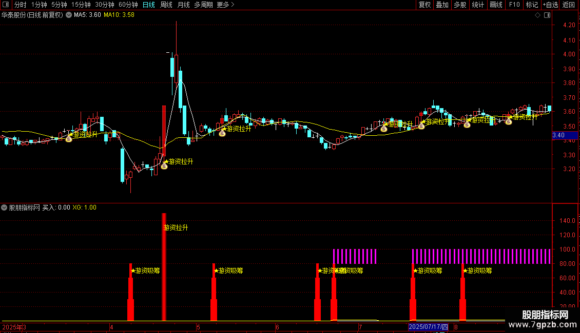 DRAWTEXT(游资拉升,L,'★游资拉升')COLORYELLOW LINETHICK6;