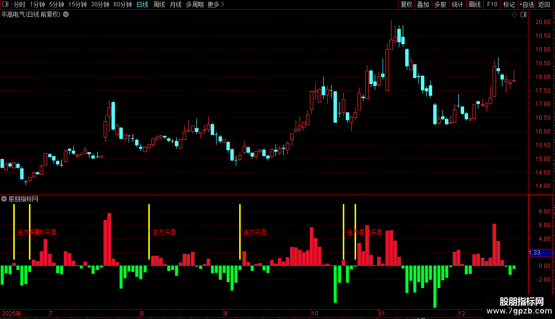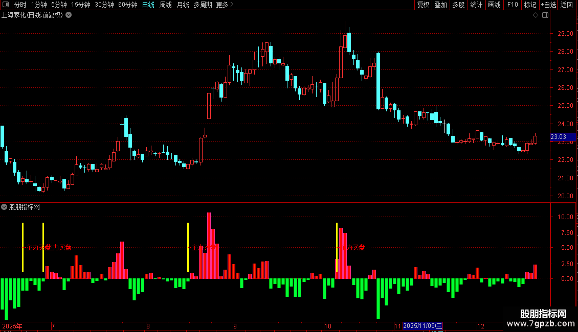 指标通过价格与短期均线的偏离程度构建“主力筹码”能量柱,用红绿颜色区分多空力量,并结合多条平滑均线捕捉主力资金异动。当主力筹码处于低位且出现特定交叉、持续弱势后快速回升等组合条件时,判定为潜在底部区域,触发“主力买盘”信号,提示可能的反弹机会。操作上适合在信号出现时结合市场环境轻仓试多,尤其关注超跌后的反转时机。