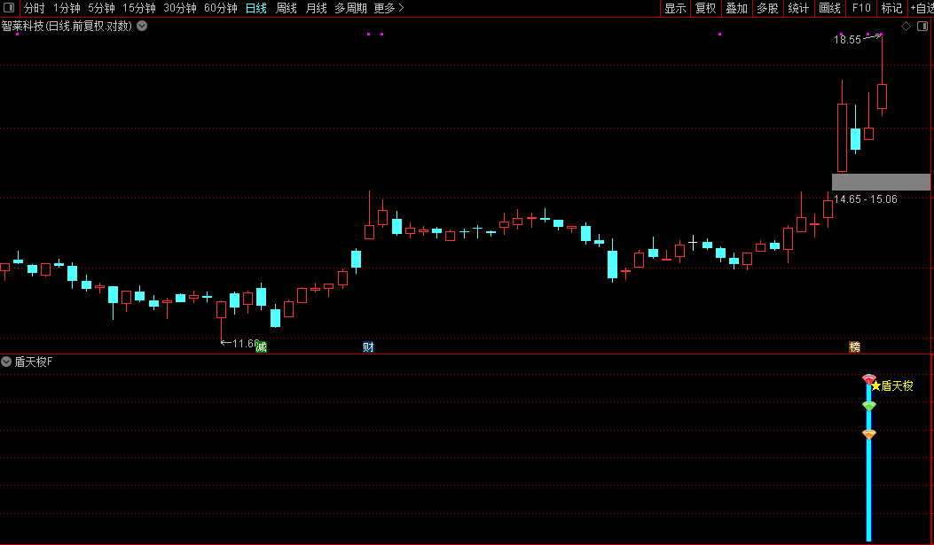 指标通过加权价格与短期均线的偏离程度,构建一个反映市场短期动能的震荡信号。当价格在特定历史周期内出现极端波动,并满足连续三日的特定涨跌组合(先阳后大跌再小幅反弹)时,触发“盾天梭”信号,提示潜在的反转或反弹机会。策略上用于捕捉急跌后的短线买入点。