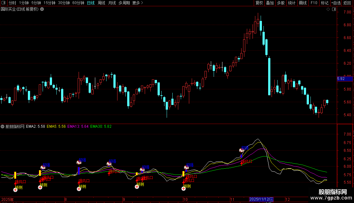 输出EMA30:收盘价的30日指数移动平均,画绿色