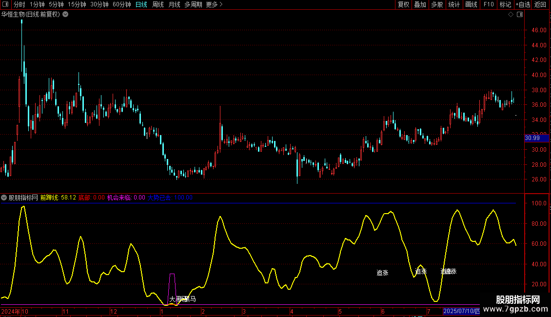 DRAWTEXT(CROSS(黑马线,A5)AND 前蹄线<80,黑马线,'追涨');