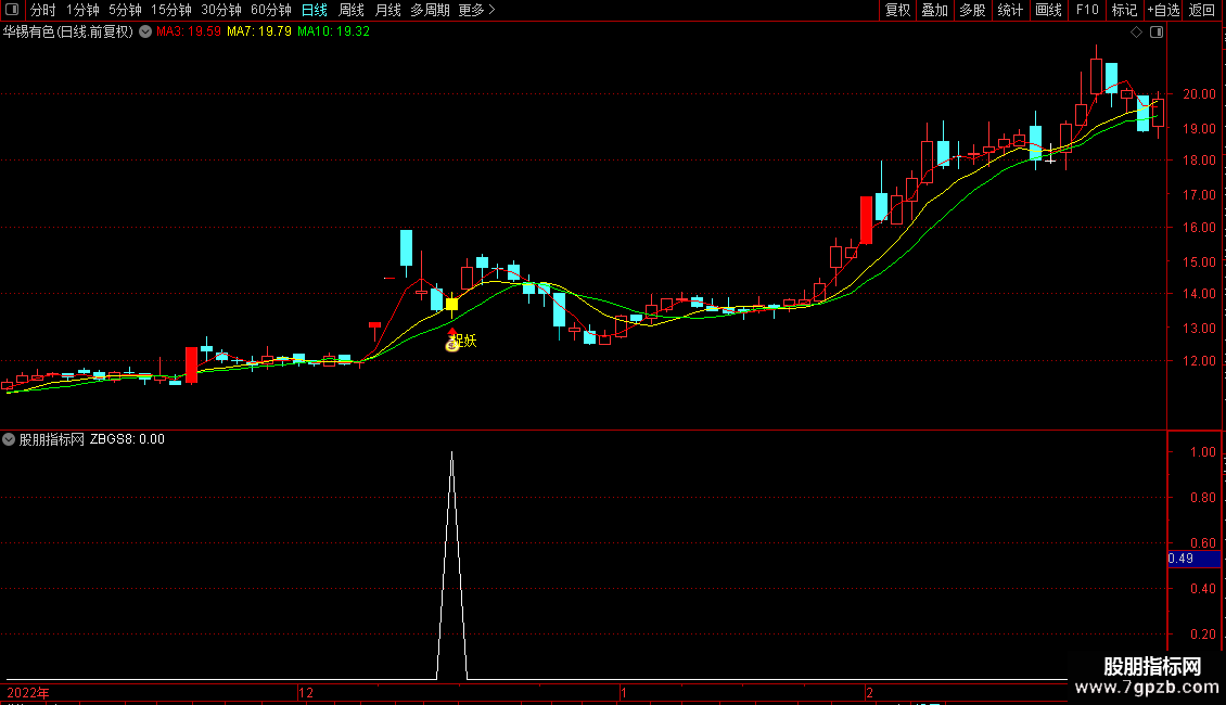同时满足时当日K线通体亮黄,并在下方叠加双图标与捉妖文字提示。