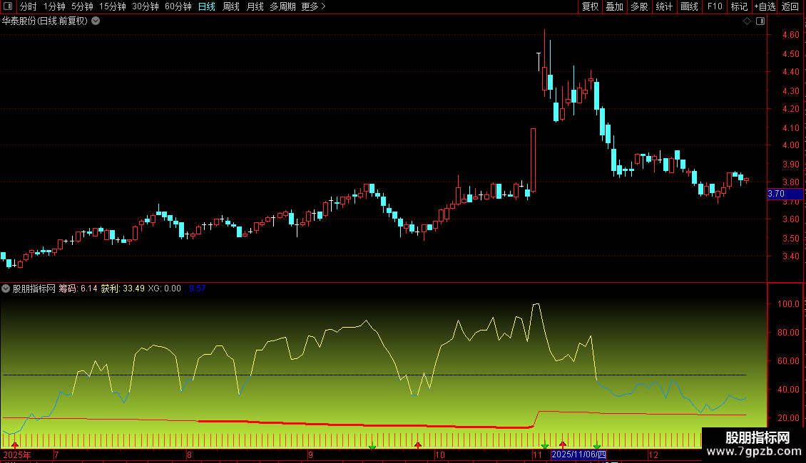 指标主要结合筹码分布、价格位置、均线系统和量价关系,用于判断市场强弱与潜在买卖点。通过分析成本集中度与获利盘比例,识别主力控盘程度;同时利用多周期均线、支撑压力线及特殊K线形态,辅助捕捉低位反弹或突破机会。当出现黄色柱状标记或“3成仓”提示时,视为阶段性低吸信号,适合轻仓介入;而ZIG转向图标则提示短期趋势拐点,可用于波段操作参考。