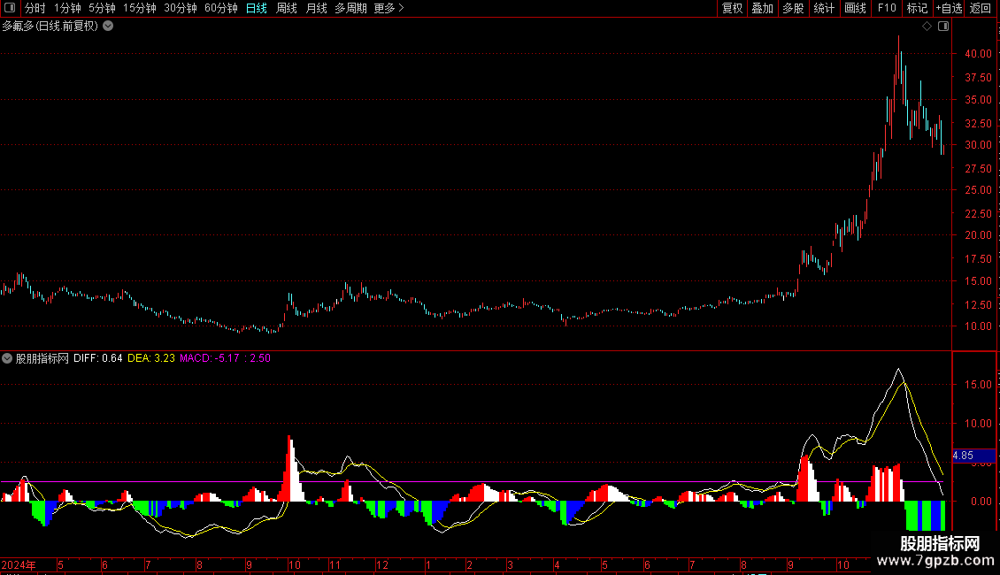 2.5; STICKLINE(MACD<REF(MACD,1)AND MACD>0,0,MACD,1,0),COLORWHITE;