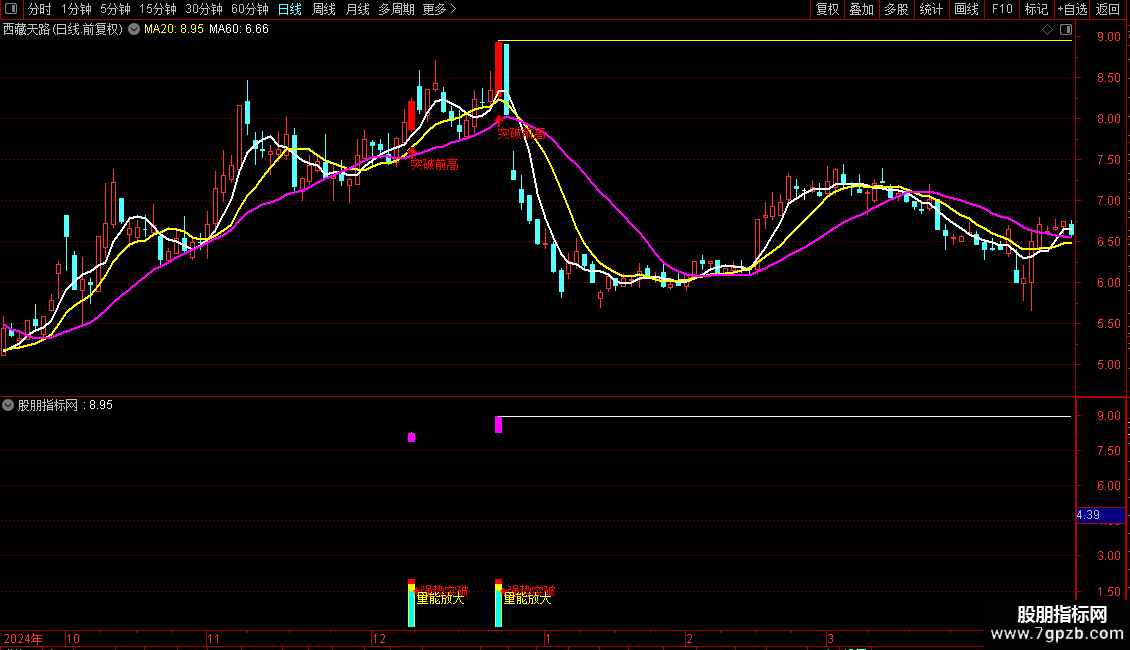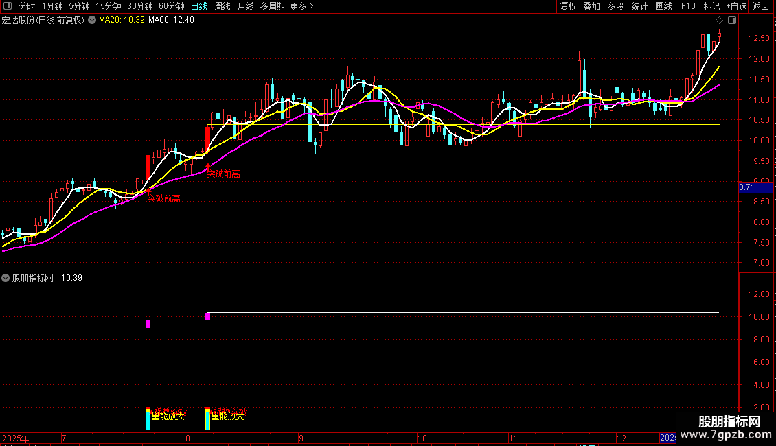指标主要用于捕捉强势突破行情。它综合了价格突破近期高点、成交量明显放大、MACD金叉以及短期均线呈多头排列等多个条件,只有当这些信号同时出现时,才触发“强势突破”提示。操作上,投资者可在信号出现时视为潜在买入机会,尤其适用于趋势启动初期的确认。整体策略强调量价配合与技术指标共振,提高信号可靠性。