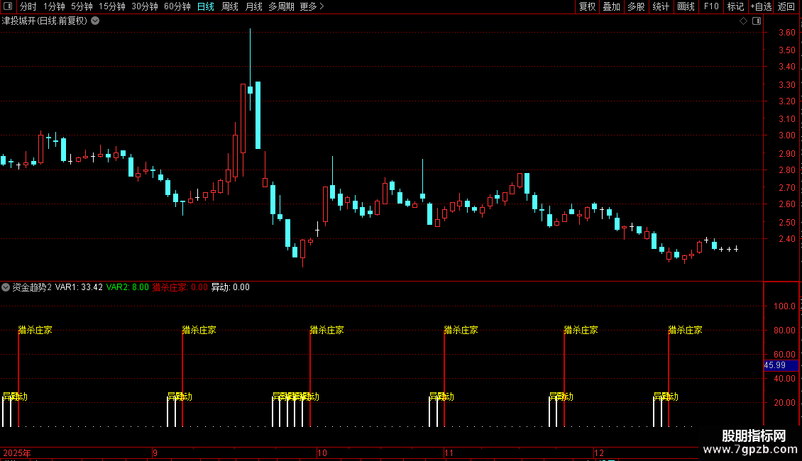 指标通过比较股价在近期高低点区间中的相对位置,构建出两条平滑曲线,用以捕捉短期价格动能的变化。当快线向上突破预设阈值时,视为强势信号,提示“猎杀庄家”;当指标回落至低位区域,则标记为“异动”,暗示市场可能出现异常波动或主力动作。整体策略偏向短线交易,适用于震荡或启动初期的行情识别。