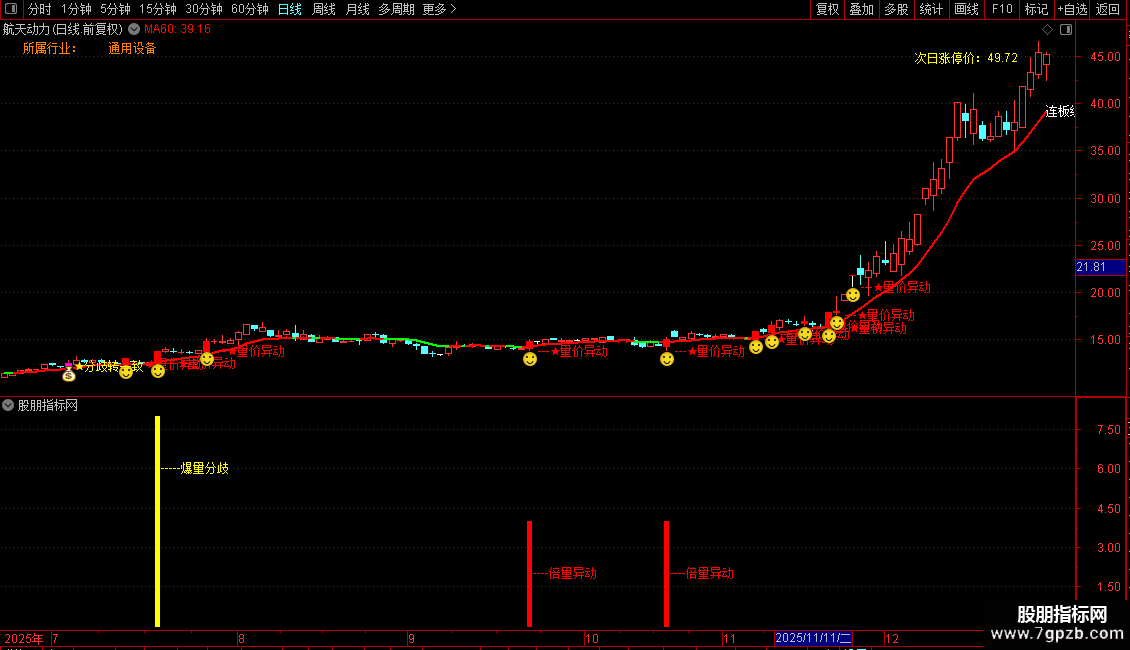 指标主要用于识别潜在强势股的启动信号,结合不同股票的涨跌停规则动态计算次日涨停价,并通过价格、成交量与均线系统判断市场情绪和资金动向。当股价放量上涨、收阳线且突破关键均线压力时,视为“分歧转一致”的买入机会;若仅出现明显放量阳线但未满足更强条件,则标记为“量价异动”,提示关注。策略上,投资者可优先关注带★信号的个股,结合行业信息辅助决策。
