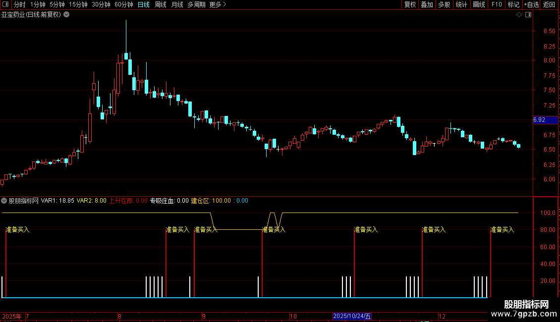 输出专吸庄血: 如果VAR1<=8,返回25,否则返回0,STICK,画白色,线宽为2