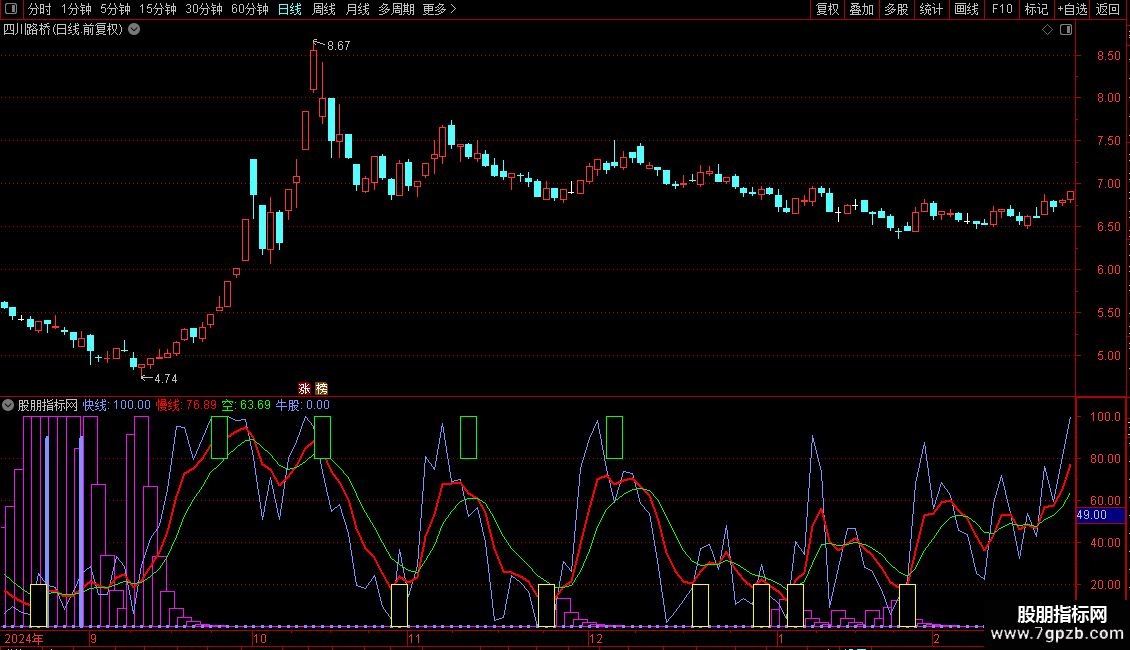 果断买入点和卖点:底部出现黄色柱子且快慢线金叉果断买入,反之顶部出现绿色柱子且快慢线死叉果断抛盘