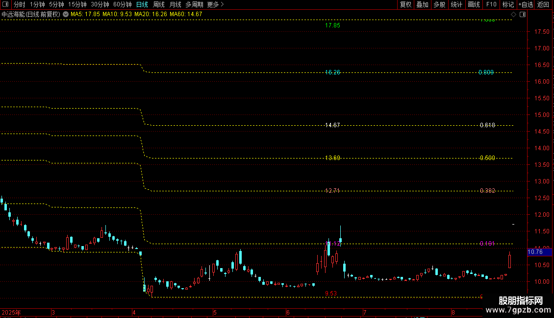 DRAWTEXT(CURRBARSCOUNT=10,H2,' 0.618'),COLORFFFFFF;