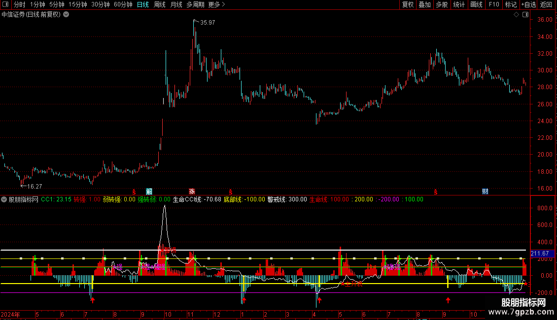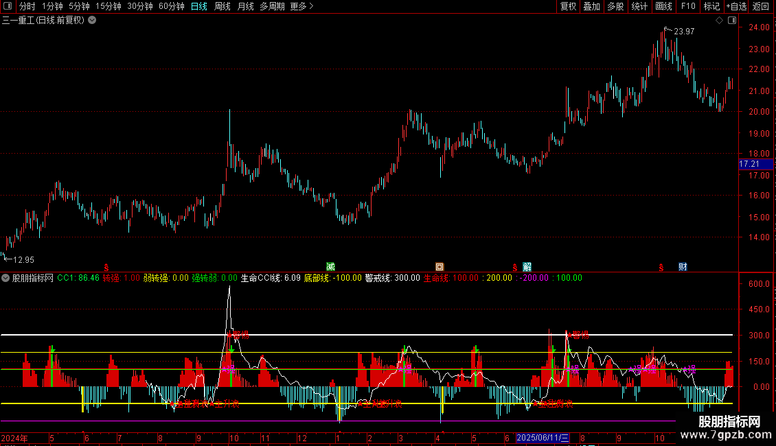 DRAWTEXT(CROSS(生命CCI线,警戒线),警戒线,'★警惕')COLORRED;