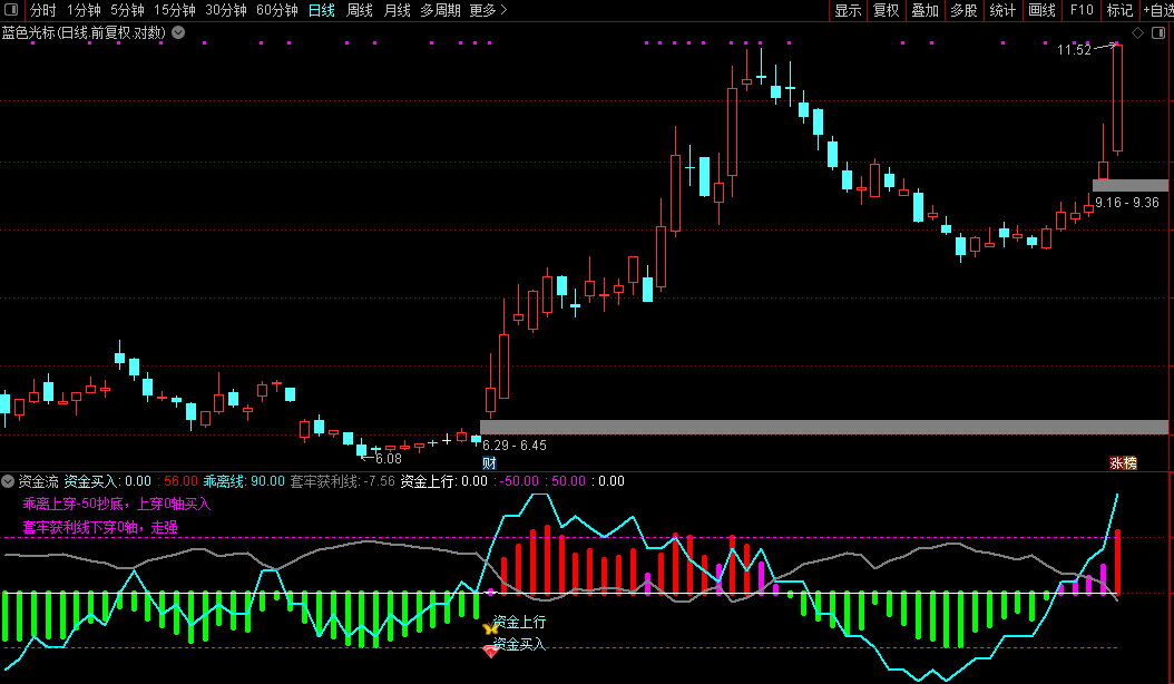 原资金流指标虽然有一定的实战作用,但是可能要表达的东西过多,导致线条零乱,看的人眼花缭乱。于是删繁就简,取其关联度较高的几个线条,其中的流金流用竖条表示,看起来要觉得比原来的方便多了。再加了二个选股信号,但是选股信号的通病都一样:准确度一般。但是可以在自己的自选股和热门股作为参考。