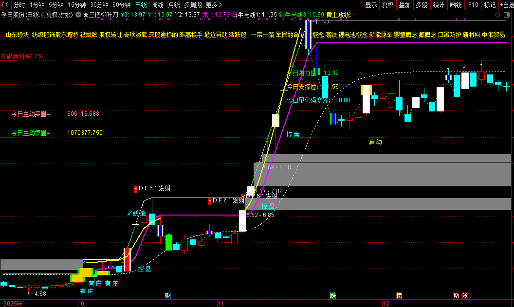 要点分析与上图相同。红白柳叶刀距离上方游资情绪线(白虚牛马线)位置越近,说明均线支撑越强。而拉升高度往往取决于低位扫货倍量,和市场对题材热度的追捧程度。因为该主图优化编辑设计了两条大于普通均线的“游资情绪线(白虚牛马线)和“最大牛股急升线Y0线(灰色柳叶刀),提高了上穿阻力强度,形成上突破拉升的可信度也最大。如果我们再从筹码峰堆积角度去审视、思考、理解这个灰色柳叶刀的消失,是不是就像股价热度让K线上穿了筹码峰,浮筹被踩在脚下。