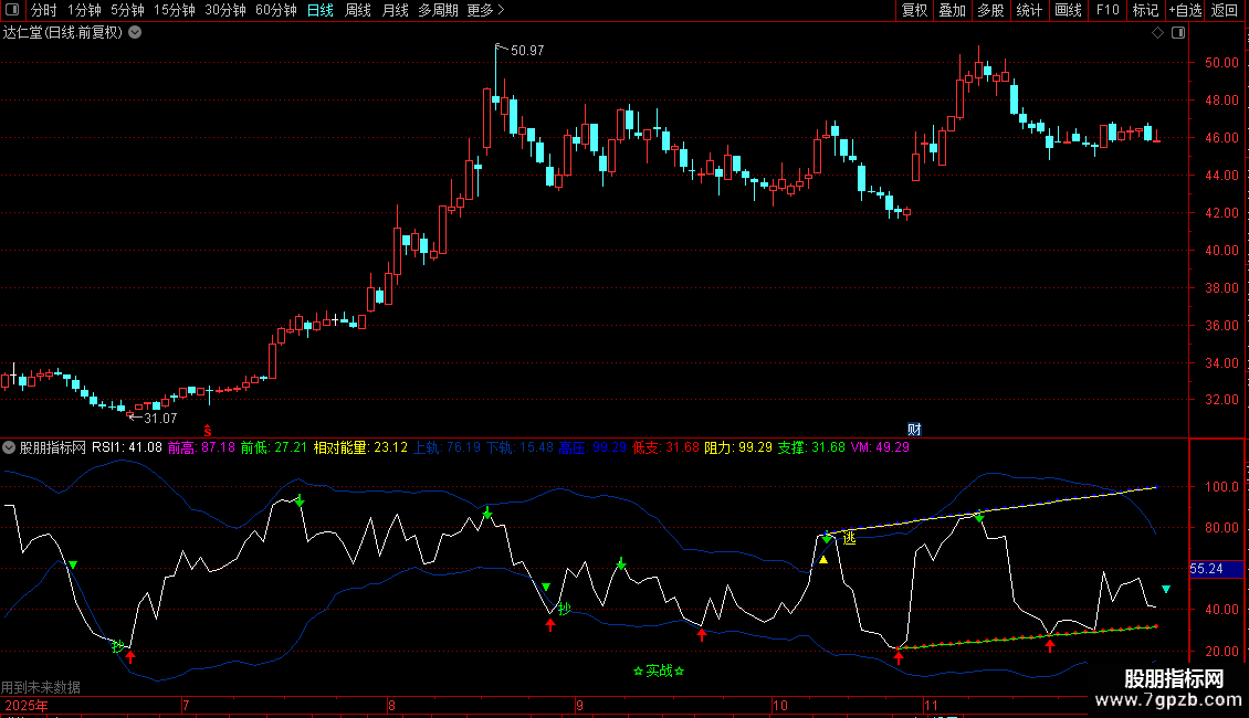 阻力:DRAWLINE(D1,RSI1,S11,RSI1,1),COLORYELLOW;
