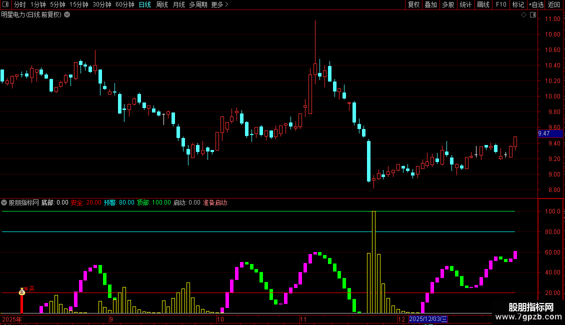 准备启动:DRAWTEXT(启动 AND COUNT(启动,10)=1,32,'准备启动'),COLORLIRED;
