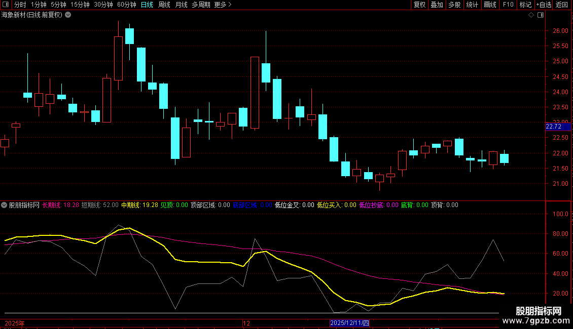 底部区域:(长期线<12 AND 中期线<8 AND (短期线<7.2 OR REF(短期线,1)<5) AND (中期线>REF(中期线,1) OR 短期线>REF(短期线,1)))