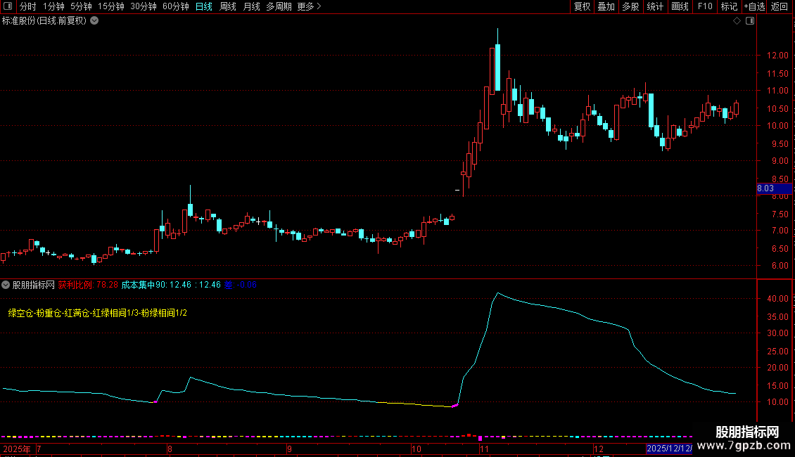 IF(成本集中90<=10 AND WINNER(CLOSE)*100>90,成本集中90,DRAWNULL),COLORMAGENTA,LINETHICK3;