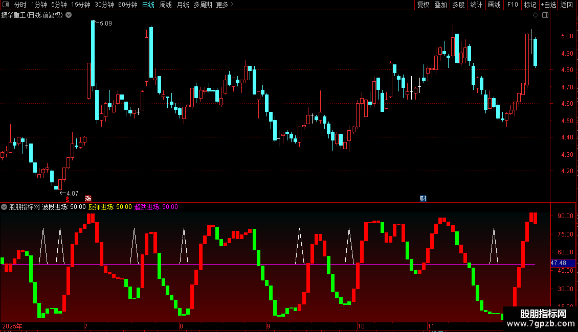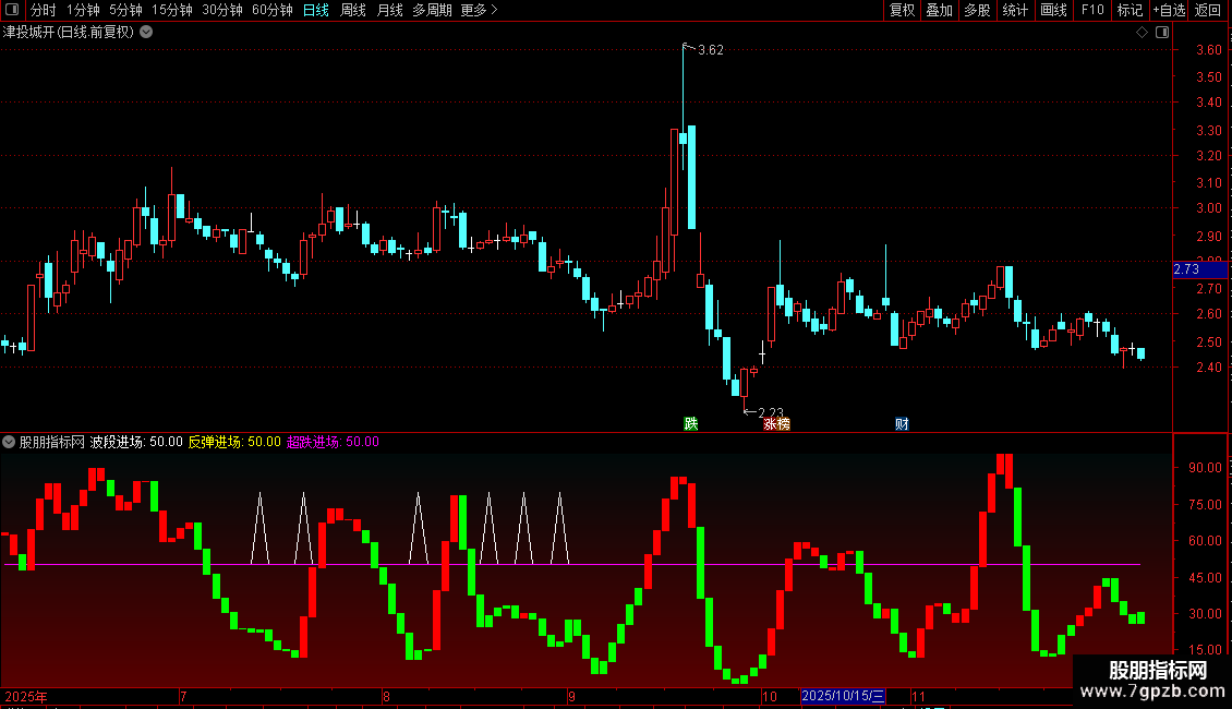 波段进场:IF(CLOSE>A AND REF(D,1)<30 AND D>REF(D,1) AND REF(D,1)<REF(D,2),80,50);