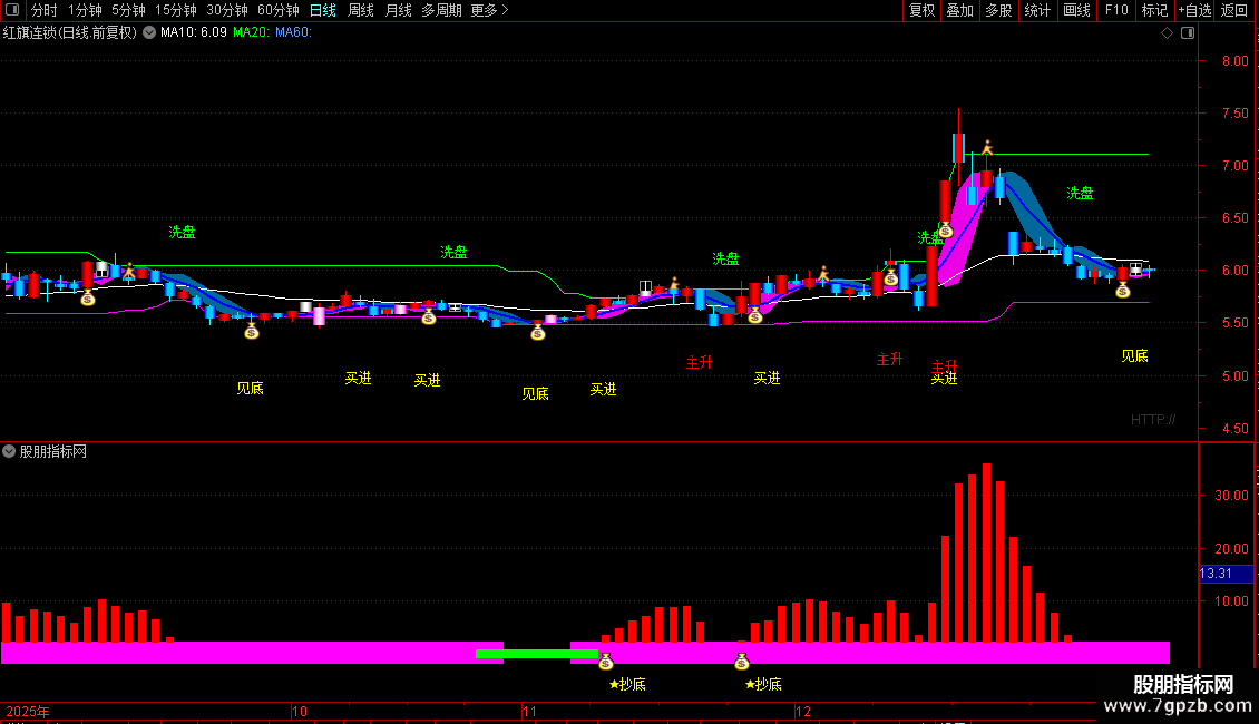 4.趋势抄底买点出现之后,副图量能柱温和放大态势,主图出现钱袋子图标是趋势加速买点。