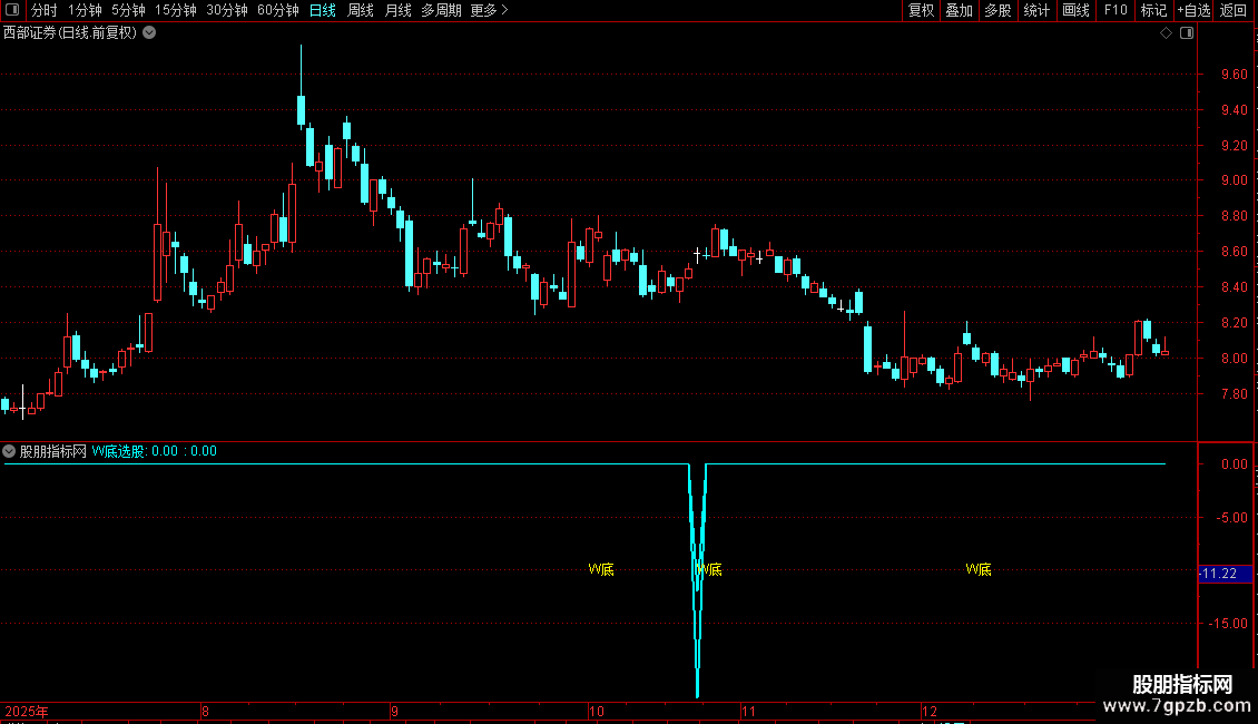 指标基于MACD构建,主要识别特定形态的“W底”反转信号。其核心逻辑是:当DIFF在零轴下方上穿DEA形成金叉,并结合DEA由正转负的背景,系统会累计符合条件的金叉次数;一旦累计次数比历史最高值多出两次,且当前次数较前一日增加,即触发选股信号。此时在图上标记“W底”字样并输出固定数值提示。操作上,投资者可将此作为潜在底部反弹的参考依据,配合其他确认信号择机介入。