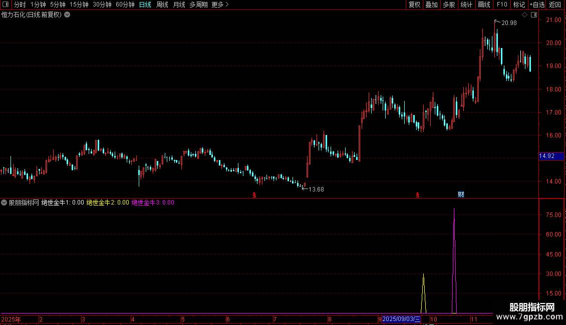 绝世金牛1:IF((A AND B AND 避开刀尖 AND COUNT(A AND B AND D,20)=1),50,0);