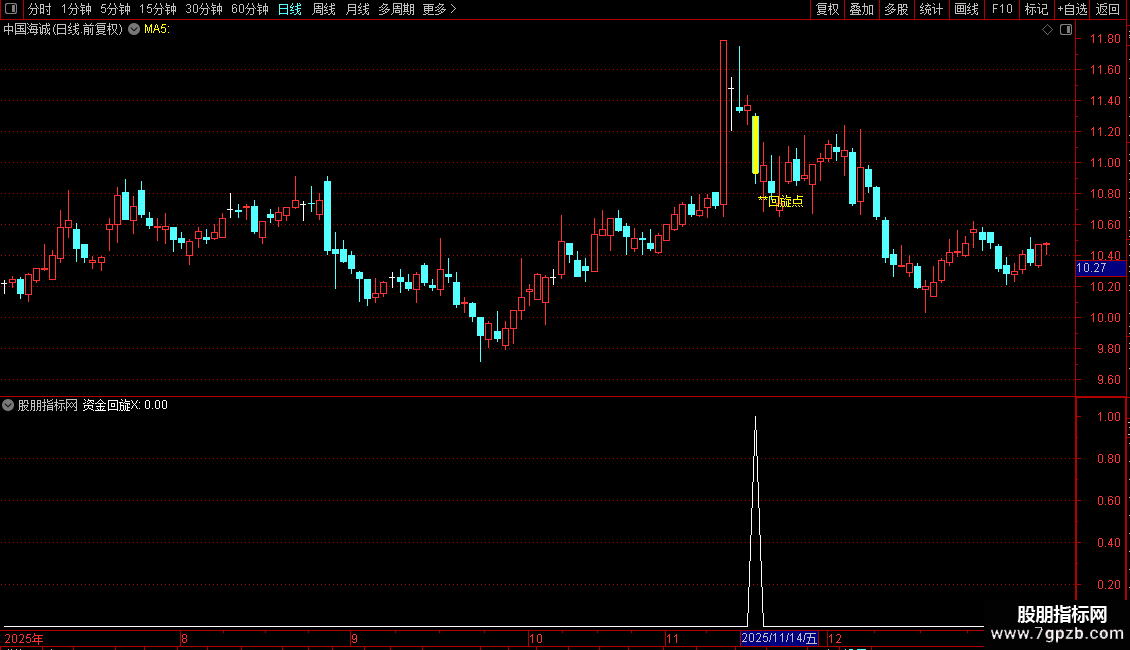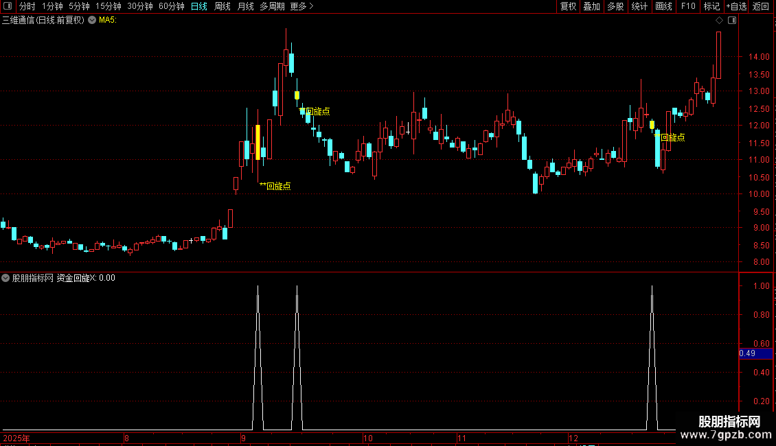1. 资金回旋指标识别强势形态中的阴阳双线,预示资金短暂回撤后再度入场,这常是第二波拉升与反弹的关键标志。