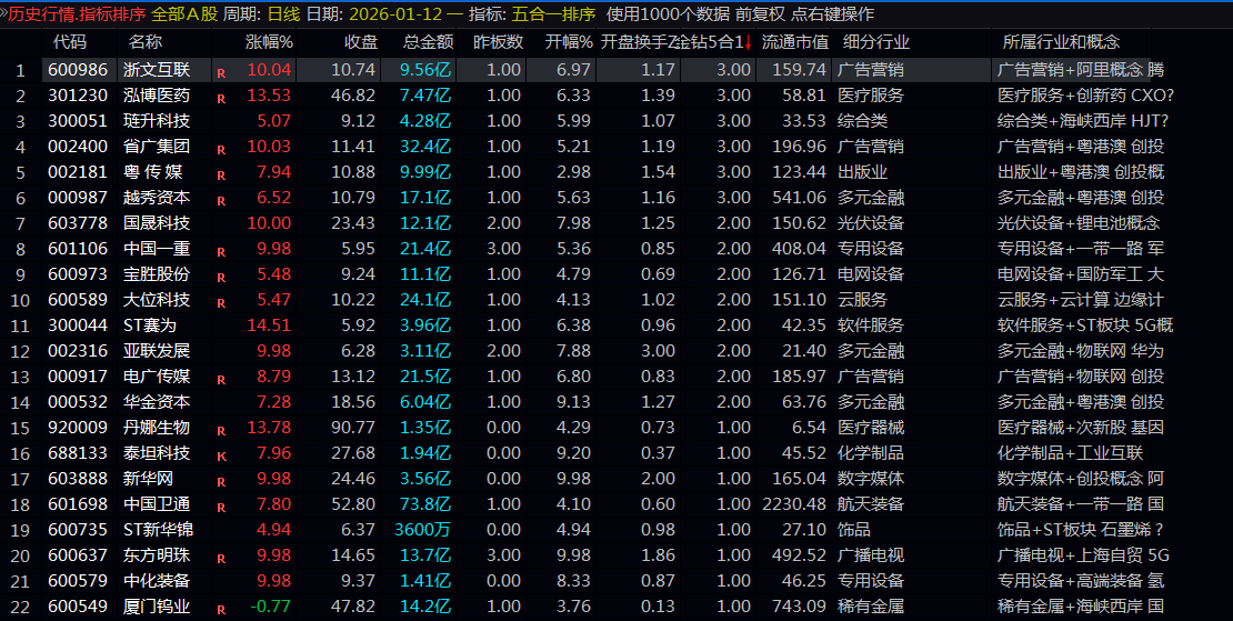 通达信【5合1竞价共振】组合共振强中选强,9:25后,排序,优选 “金钻5合1”中 数值大的票,也可以通过选股选出大于等于共振数3的票。  指标只是个技术参数,左右不了市场情绪,据此操作,风险自担。投资有风险 ,入市需谨慎。为方便大家查看,把昨板数,开盘换手Z,流通市值,行业 概念都加上了。