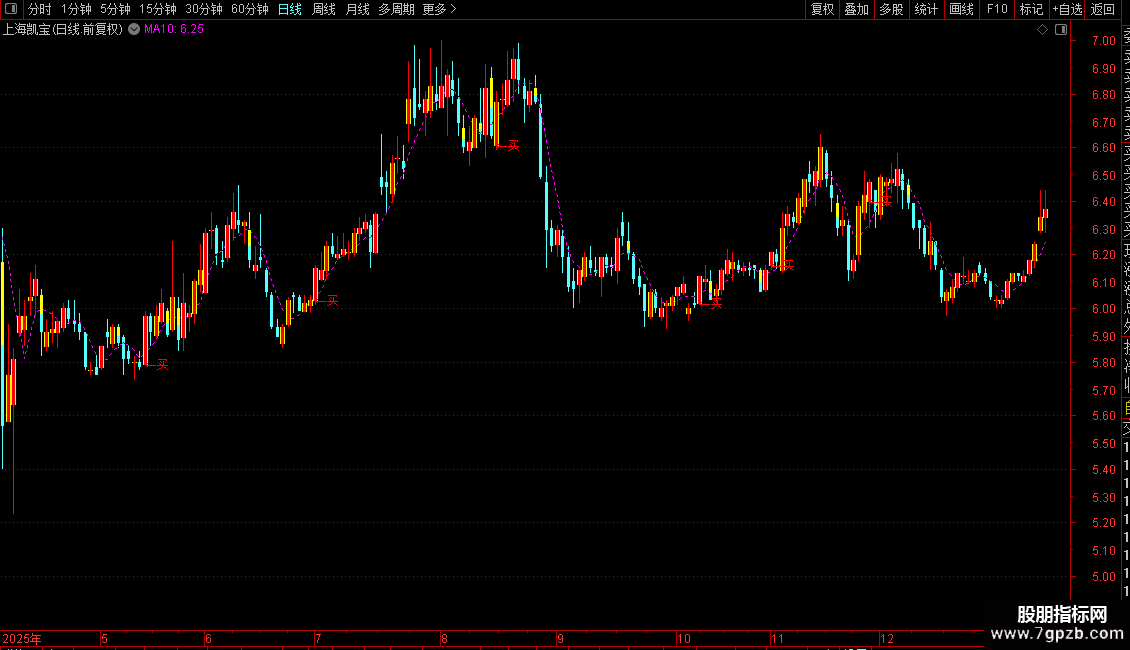 DRAWTEXT(CROSS(快,慢) AND C>=快 AND C>O AND C< REF(C,1)*1.07 ,O,'←买')COLORRED;