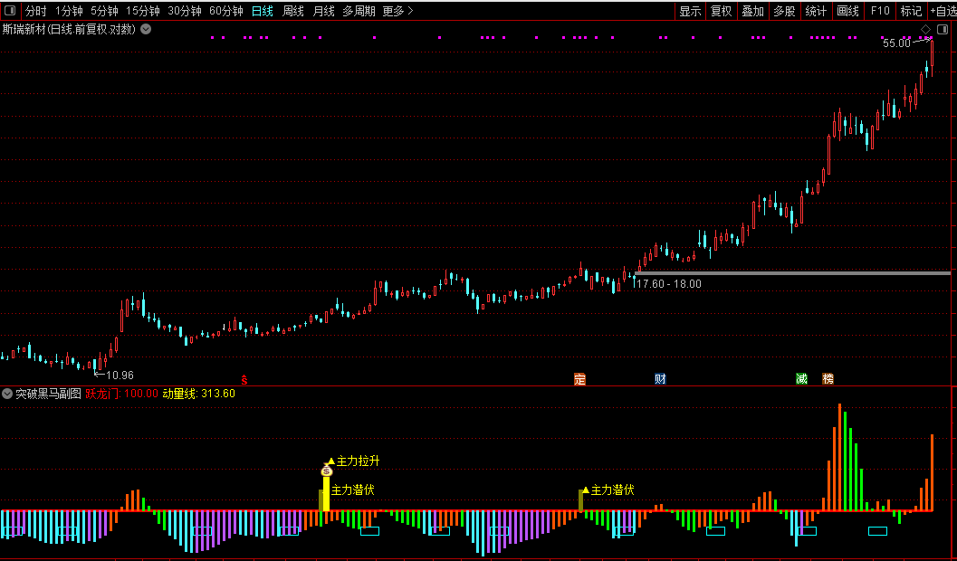 该指标融合多重技术分析逻辑,旨在识别股票趋势转折与主力动向。其核心通过相对强弱、趋势动量及自定义支撑压力线构建综合判断体系,并结合成交量与MACD等经典指标进行多维度验证。当指标出现“建仓”“洗盘”“异动”“主力拉升”等信号时,提示可能的波段起点或主力行为。整体设计侧重于捕捉黑马股启动前后的关键节点,为趋势跟踪与择时提供参考。