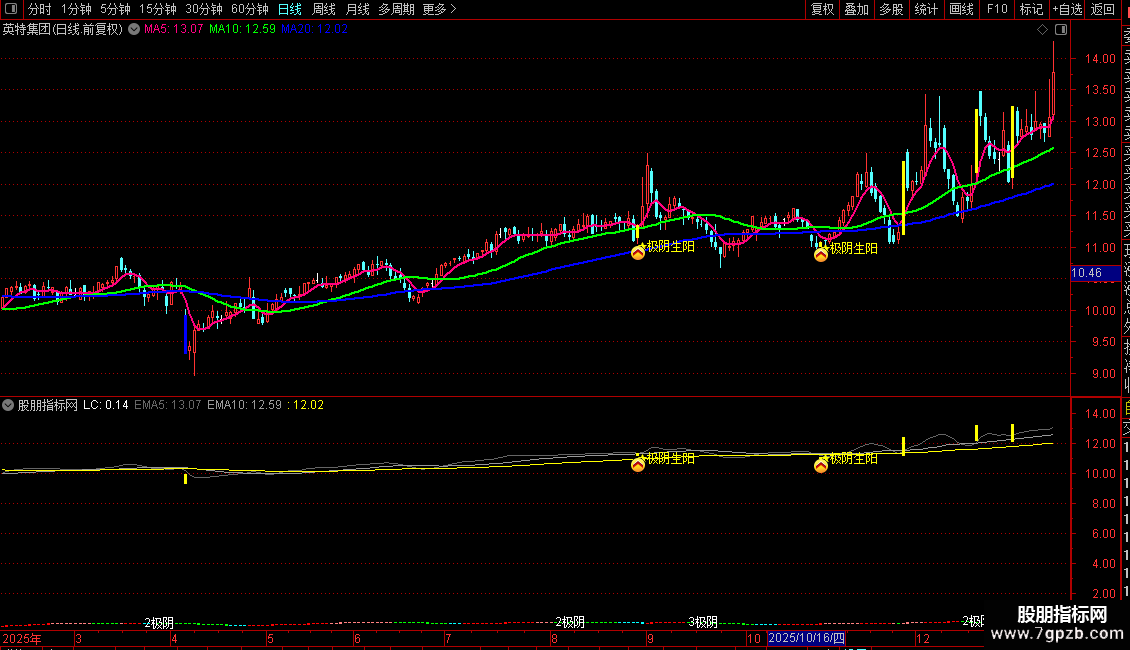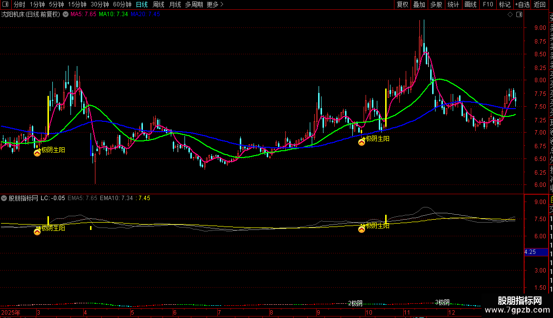 1. 主图:在K线图加载后,重点关注黄色“★极阴生阳”标注,结合涨停(黄K)、大跌(蓝K)辅助判断反转时机;