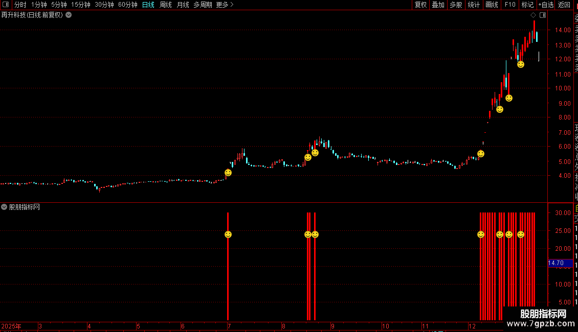 副图指标“风口起爆”:在副图区域同步显示降龙指标和信号。通过图标和色带标注超买与启动点,辅助确认主图信号,增强判断准确性。