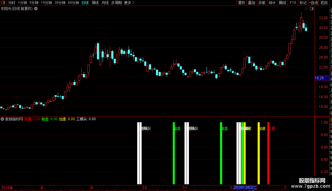 指标通过价格与成交量的关系,结合均线系统,识别股票的短期交易机会。"抓量"关注于股价突破短期均线且成交量显著放大时的机会;"暗盘"则捕捉股价在接近中期均线前的短暂调整阶段;"加速"强调股价有效突破长期均线并保持上升趋势的强势信号;而"三根尖"用于发现股价触底反弹的早期迹象。操作策略建议依据不同信号的特点进行灵活配置,比如利用"抓量"和"加速"追求快速上涨的机会,用"暗盘"和"三根尖"寻找反转或调整结束的入场点。