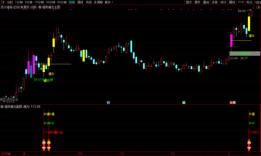 4、主图中黄色柱子上的“成龙”信号,标志着该股票即将突破,是买入的绝佳时机。这一信号预示着股票将迎来上涨趋势,体现了投资中的至简之道。