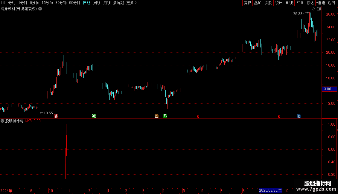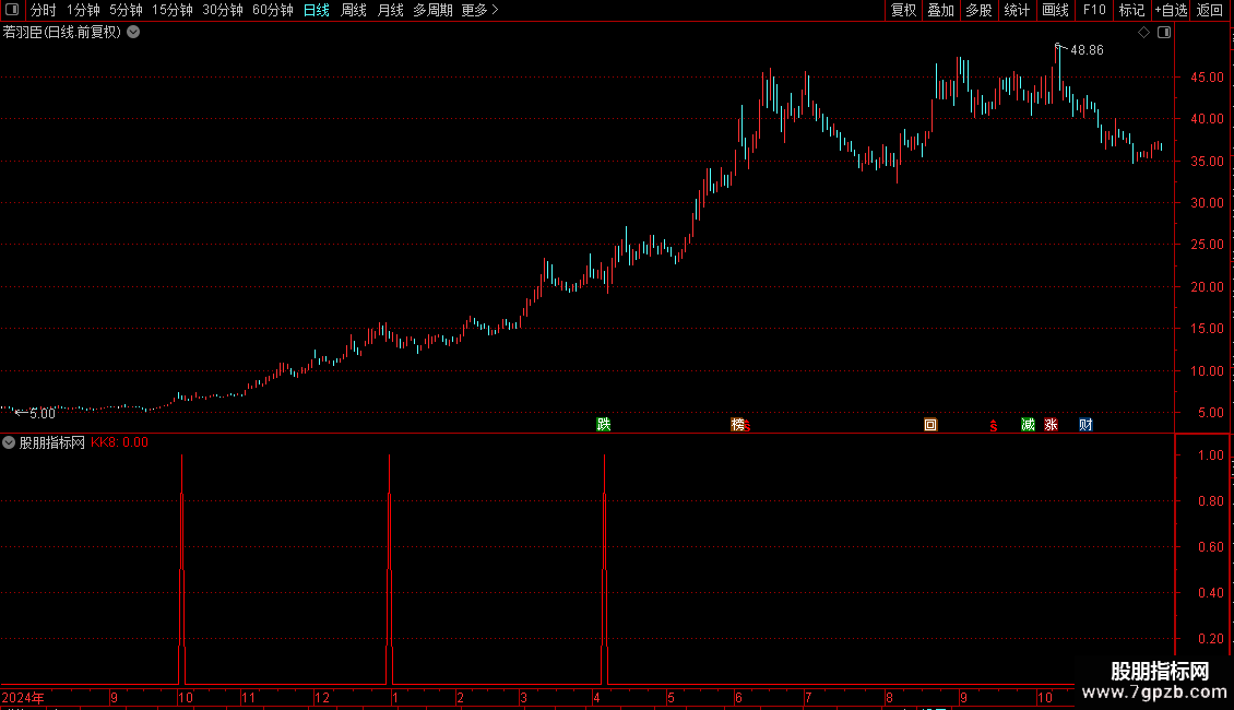 KK8:C<REF(C,1)*0.907 AND MA5>=REF(MA5,1) AND MA1>MA2 AND (H<REF(O,1) OR H<=REF(C,1)),COLORRED;