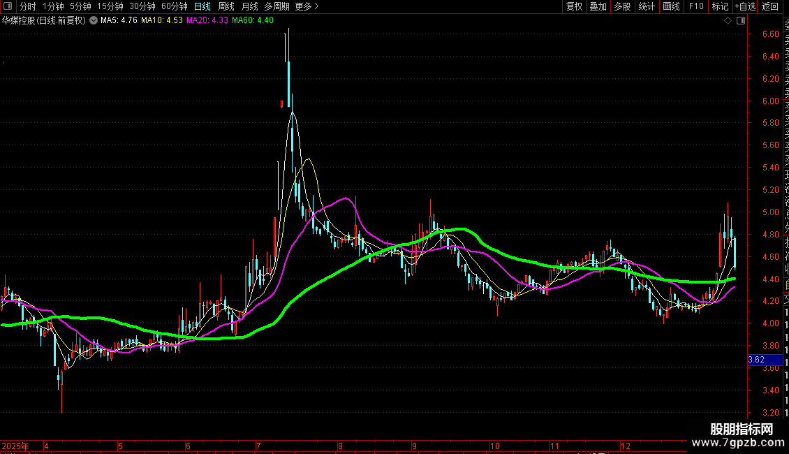 5 当四条均线紧密粘合时,常为大黑马启动前兆。此时应密切留意盘面。一旦出现放量长阳突破绿色和紫色趋势线,表明主力开始拉升,应及时跟进布局。