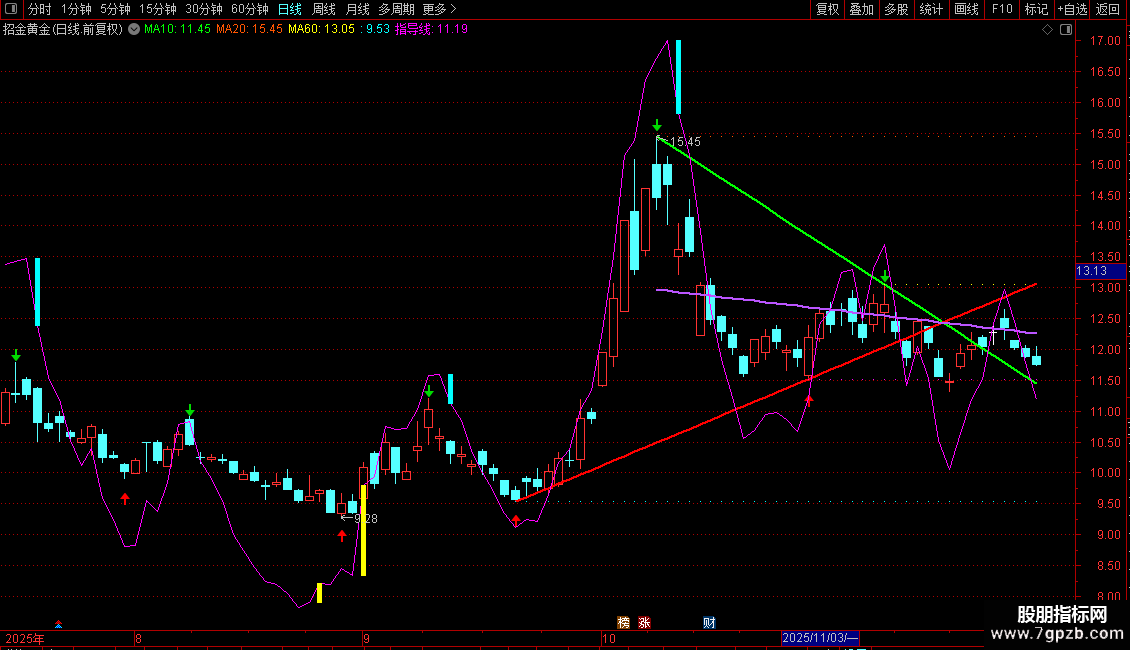 指导线:重心+GAO*(RSI-0.5),COLORMAGENTA,LINETHICK1;