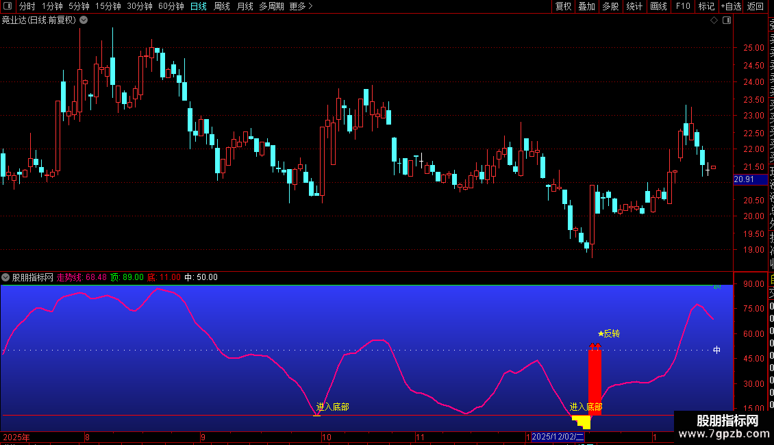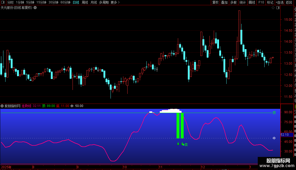 指标主要用于判断股价是否处于极端超买或超卖区域,并结合价格与动态区间中轴的位置关系,提示潜在的反转买卖点。当指标值处于低位并向上突破关键阈值、且价格位于中线以下时,视为底部反弹信号,可考虑买入;反之,当指标值处于高位并向下穿越阈值、且价格在中线之上时,视为顶部回落信号,适合卖出。整体策略强调“低吸高抛”,适用于震荡或趋势初期的波段操作。